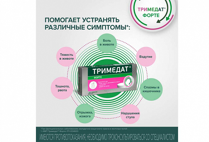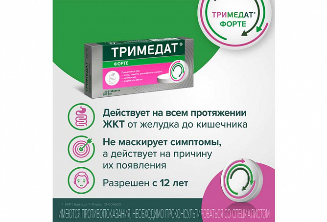 В экспериментальных исследованиях не выявлено данных о тератогенности и эмбриотоксичности препарата. Тем не менее, в связи с отсутствием необходимых клинических данных, применение препарата Тримедат® форте в период беременности противопоказано.