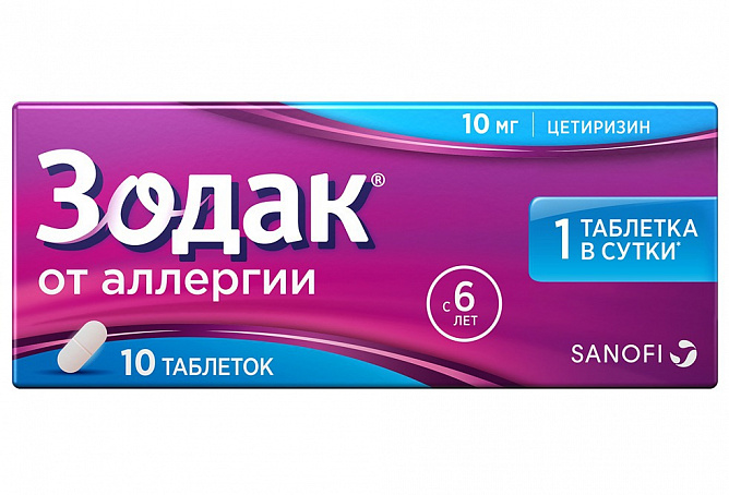 кетоконазолом или псевдоэфедрином не влияет на фармакокинетические параметры цетиризина. Фармакокинетических взаимодействий не наблюдалось. Согласно испытаниям in vitro, цетиризин не влияет на эффект связывания белка варфарина. Одновременный прием азитромицина, эритромицина, кетоконазола, теофиллина и псевдоэфедрина не выявил существенных изменений в клинических лабораторных показателях, жизненно важных функциях и ЭКГ. В исследовании с одновременным приемом теофиллина (400 мг в день) и цетиризина (20 мг в день) было обнаружено незначительное, но статистически достоверное повышение 24-часовой AUC (площади под кривой) на 19% для цетиризина и на 11% для теофиллина. Кроме того, максимальные уровни в плазме крови увеличились до 7,7% и 6,4% соответственно для цетиризина и теофиллина. Одновременно клиренс цетиризина уменьшился на -16%, а также на - 10% в случае теофиллина, когда цетиризин принимали пациенты, которые ранее получали лечение теофиллином. Тем не менее, предварительное лечение цетиризином не оказало существенного влияния на фармакокинетические параметры теофиллина. После однократного приема цетиризина в дозе 10 мг эффект алкоголя (0,8 ‰) значительно не усиливался; статистически значимое взаимодействие с 5 мг диазепама было доказано в одном из 16 психометрических тестов. Одновременный прием 10 мг цетиризина в день с глипизидом привел к незначительному снижению показателей глюкозы. Этот эффект не имеет клинического значения. Тем не менее, рекомендуется раздельный прием - глипизид утром и цетиризин вечером.Степень всасывания цетиризина не снижается при одновременном приеме пищи, хотя всасывание замедляется на 1 час. В исследовании с многократным приемом ритонавира (600 мг два раза в день) и цетиризина (10 мг в день) степень экспозиции цетиризина была увеличена примерно на 40%, в то время как экспозиция ритонавира незначительно изменилась (-11%) вследствие сопутствующего приема цетиризина.Если Вы применяете вышеперечисленные или другие лекарственные препараты (в том числе безрецептурные) перед применением препарата Зодак® проконсультируйтесь с врачом.