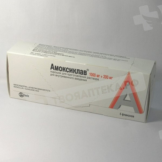 По 500 мг амоксициллина и 100 мг клавулановой кислоты или по 1000 мг амоксициллина и 200 мг клавулановой кислоты во флакон бесцветного стекла, закрытый резиновой пробкой и обжатый алюминиевым колпачком с пластмассовой крышкой.
