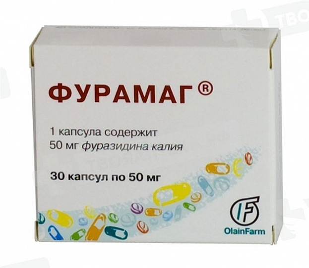 Абсорбция происходит в тонкой кишке, путем пассивной диффузии. Всасывание нитрофуранов из дистального сегмента тонкой кишки превышает всасывание из проксимального и среднего сегмента, соответственно в 2 и 4 раза (следует учитывать при одновременном лечении урогенитальных инфекций и заболеваний желудочно- кишечного тракта, в т.ч. хронические энтериты). Нитрофураны плохо всасываются в толстой кишке. Фурамаг, являясь смесью фуразядина калия и магния гидроксикарбоната в соотношении 1:1, при пероральном введении имеет более высокую биодоступность, чем простой фуразидин (после приема капсулы Фурамага в кислой среде желудка не происходит превращение фуразидина калия в плохо растворимый фуразидин). В организме фуразидин распределяется равномерно. Клинически важно высокое содержание действующего вещества в лимфе (задерживает распространение инфекции по лимфатическим путям). В желчи концентрация его в несколько раз выше, чем в сыворотке крови, а в ликворе - в несколько раз ниже, чем в сыворотке. В слюне содержание фуразидина составляет 30 % от его концентрации в сыворотке крови. Концентрация фуразидина в крови и тканях сравнительно небольшая, что связано с быстрым его выделением, при этом концентрация в моче значительно выше, чем в крови. Максимальная концентрация в крови сохраняется от 3 до 7 или 8 часов, в моче фуразидин обнаруживается через 3-4 часа после применения. В отличие от нитрофурантоина (фурадонина), после принятия Фурамага рН мочи не меняется. Через 4 часа после принятия лекарственного средства Фурамаг концентрация фуразидина в моче значительно превышает ту концентрацию, которая образуется после приема такой же дозы лекарственного средства Фурагин. Выделение через почки происходит путем клубочковой фильтрации и канальцевой секреции (85 %), частично подвергается обратной реабсорбции в канальцах. При низких концентрациях фуразидина в моче преобладает процесс фильтрации и секреции, при высоких концентрациях уменьшается секреция и увеличивается реабсорбция. Фуразидин, являясь слабой кислотой, в кислой моче не диссоциирует, подвергается интенсивной реабсорбции, что может усилить развитие системных побочных эффектов. При защелачивании мочи выведение фуразидина усиливается. Действующее вещество препарата незначительно биотрансформируется (менее 10 % введенной дозы), при снижении выделительной функции почек интенсивность метаболизма возрастает.