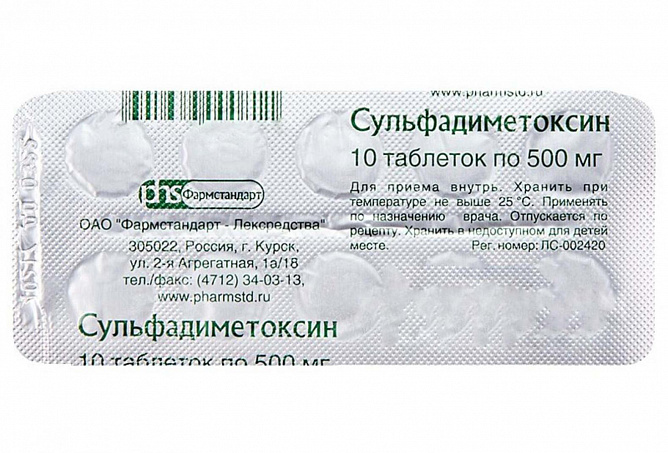 1 таблетка содержит сульфадиметоксина 0,2 или 0,5 г; в упаковке 10 шт.