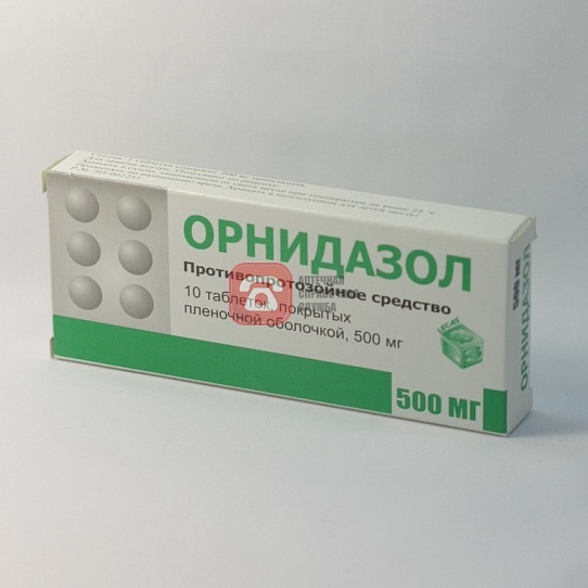 Состав Каждая таблетка содержит: Активное вещество - орнидазол (500 мг) Вспомогательные вещества - лактоза (сахар молочный), целлюлоза микрокристаллическая, повидон (поливинилпирролидон), натрия лаурилсульфат, кальция стеарат, кремния диоксид коллоидный (аэросил), примеллоза (кроскармеллоза натрия), гипромеллоза (гидроксипропилметилцеллюлоза), полиэтиленгликоль 4000 (полиэтиленоксид, макрогол), тальк, титана диоксид.