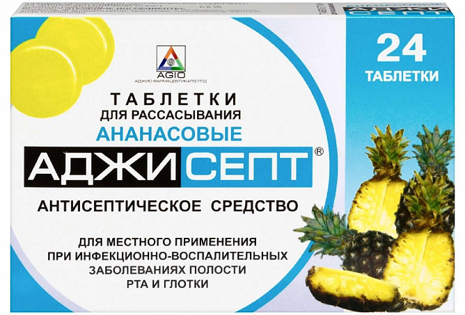 Аджисепт Ананас - это комбинированный антисептический препарат для местного применения в полости рта и глотки. Таблетки обладают прекрасным ароматом и вкусом ананаса, что делает их приятными в использовании. Оказывает противомикробное действие. Активен в отношении грамположительных и грамотрицательных микроорганизмов. Таблетки упакованы в удобный формат, поэтому их можно брать с собой в дорогу или на работу.