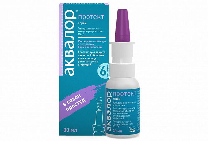 Аквалор протект содержит гипертонический раствор морской воды, имеющий более высокие концентрации минеральных солей (15г/л) посравнению склетками имежклеточным пространством слизистой оболочки полости носа.