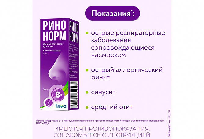 Острые респираторные заболевания с явлениями ринита (насморка), острый аллергический ринит, поллиноз, синусит, евстахиит, средний отит (в составе комбинированной терапии для уменьшения отека слизистой оболочки носоглотки). Подготовка пациента к диагностическим манипуляциям в носовых ходах.