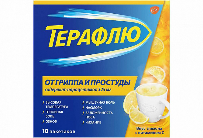 ТераФлю помогает облегчать симптомы гриппа и простуды, такие как повышенная температура, озноб, ломота в теле, головная боль, боль в мышцах, насморк, заложенность носа, чихание. Продукт начинает действовать уже через 10 минут.