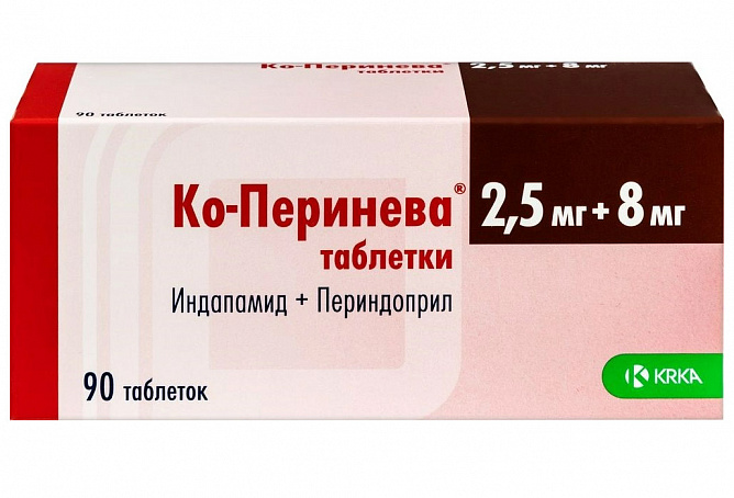Периндоприл оказывает ингибирующее действие на РААС и уменьшает выведение ионов калия почками на фоне приема индапамида. Риск развития гипокалиемии (содержание калия в сыворотке крови менее 3.4 ммоль/л) у пациентов на фоне применения препарата Ко-Перинева в суточной дозе 2 мг/0,625 мг составляет 2%, 4 мг/1,25 мг - 4 % и 8 мг/2,5 мг - 6%.