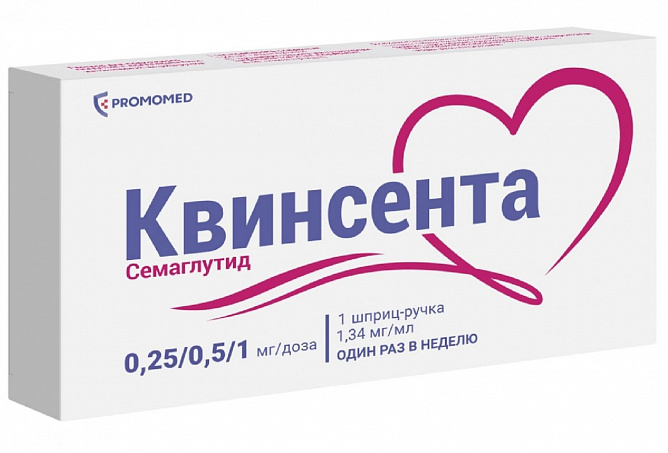 Препарат Квинсента содержит в качестве действующего вещества семаглутид, который представляет собой химически синтезированный пептид и является агонистом рецепторов ГПП-1 (ГПП-1Р). Семаглутид – это аналог человеческого ГПП-1, имеющий 94 % гомологий с аминокислотной последовательностью эндогенного ГПП-1.
