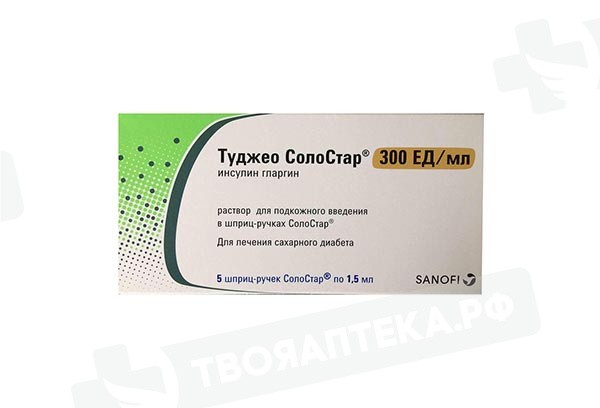 Для одного и того же количества единиц инсулина гларгина вводимый объем препарата Туджео СолоСтар составляет одну третью часть от такового при введении инсулина гларгина 100 ЕД/мл.