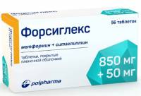 Действующие вещества: ситаглиптина фосфата моногидрат 64,25 мг (эквивалентно 50 мг ситаглиптина) и метформина гидрохлорид 1000 мг.