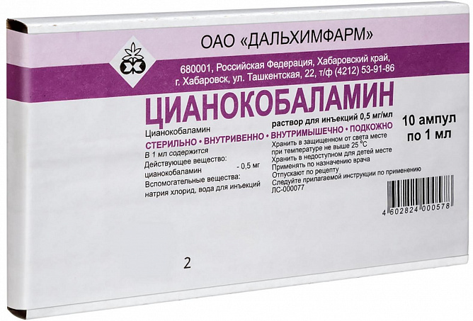 Активное вещество: цианокобаламин - 0,2 мг или 0,5 мг;