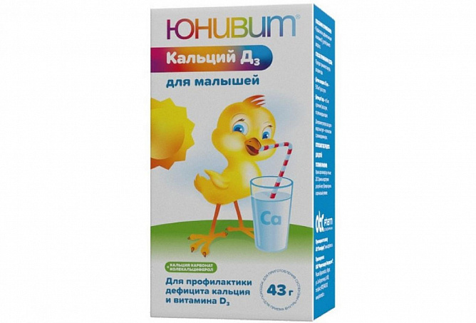 ЮниВит Кальций+Д3 для малышей – это комбинированный препарат, предназначенный для восполнения дефицита кальция и витамина D3 в организме. Лекарственная форма специально разработана для детей раннего возраста до 3-х лет. Препарат содержит важные микроэлементы – кальций и витамин D3, которые необходимы для нормального роста и развития ребенка. Форма выпуска – флакон, содержащий порошок для приготовления суспензии. Перед применением рекомендуется посоветоваться с врачом.