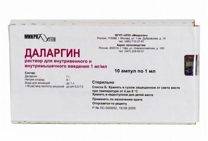 1 ампула содержит: Даларгин (Тирозил-D-аланил-глицил-фенилаланил-лейцил-аргинина-диацетат [в пересчете на тирозил-D-аланил-глицил-фенилаланил-лейцил-аргинин]) – 1 мг.