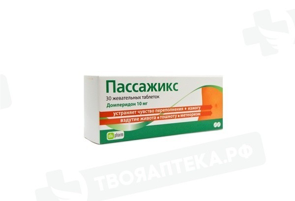 Торговое наименование Пассажикс Экспресс Международное непатентованное или группировочное наименование Домперидон Лекарственная форма Таблетки, диспергируемые в полости рта (со вкусом апельсина, со вкусом ментола) Состав 1 таблетка, диспергируемая в полости рта, содержит: действующее вещество: домперидон 10 мг;вспомогательные вещества: декстрозы моногидрат, крахмал кукурузный, кросповидон (коллидон CL-SF), основной бутил метакрилата сополимер (Эудрагит Е РО), кремния диоксид коллоидный (аэросил), аспартам, натрия лаурилсульфат, левоментол, ароматизатор апельсиновый (мальтодекстрин, гуммиарабик, бутилгидроксианизол, вкусоароматические вещества) (для таблеток со вкусом апельсина), натрия стеарилфумарат.