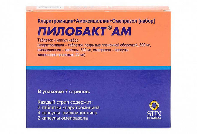 Каждый стрип, содержащий таблетки и капсулы набора Пилобакт AM, рассчитан на один день лечения и состоит из двух частей: розовой с надписью "утро" и синей с надписью "вечер". В утренний приём перед едой следует принять содержимое части "утро" полностью (одну таблетку кларитромицина, две капсулы амоксициллина, одну капсулу омепразола). В вечерний приём перед едой следует принять содержимое части "вечер" полностью (одну таблетку кларитромицина, две капсулы амоксициллина, одну капсулу омепразола).