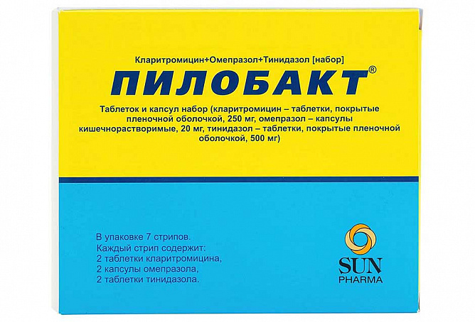 Каждый стрип, содержащий таблетки и капсулы набора Пилобакт®, рассчитан на один день лечения и состоит из двух частей: желтой с надписью “утро” и голубой с надписью “вечер”.