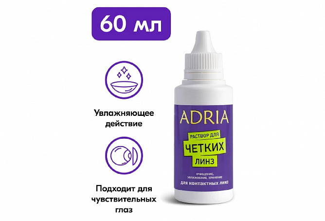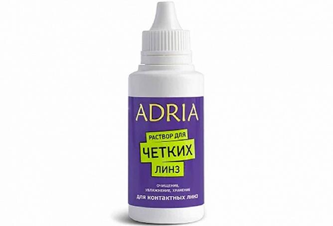 Универсальный раствор ADRIA Plus создан для бережного ухода за мягкими контактными линзами — прозрачными и цветными. Он эффективно очищает от всех видов загрязнений, дезинфицирует и увлажняет линзу. Упаковка 60 мл. — удобный трэвел-формат