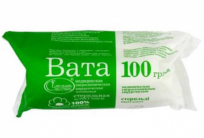 Вата медицинская гигроскопическая хирургическая стерильная по ГОСТ 5556-81.