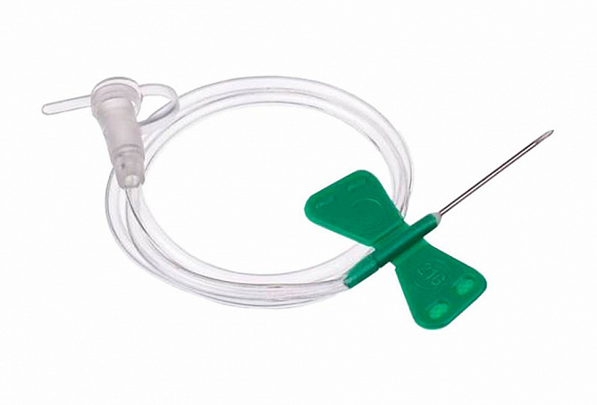 Игла катетер бабочка- представляет собой гибкую, тонкую прозрачную трубку из поливинилхлорида медицинской маркидлиной 300 мм, которая позволяет проводить манипуляции вдали от места венепункции, снижая риск смещения иглы и случайного повреждения вены.
