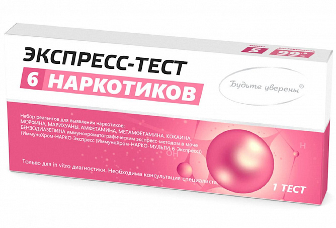 Набор ИммуноХром-НАРКО-Экспресс предназначен для in vitro одноэтапного быстрого качественного определения наркотических соединений: морфина, марихуаны, амфетамина, метамфетамина, кокаина, бензодиазепина в биологических жидкостях организма человека. Для подтверждения положительных результатов рекомендуется использовать метод газовой хроматографии/масс-спектрометрии (ГХ/МС).