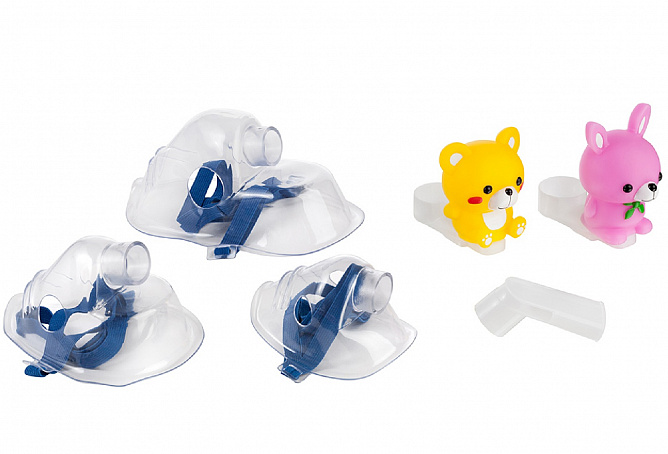 Компрессор, небулайзерная камера, детские аксессуары (веселый медвежонок, счастливый кролик), воздуховодная трубка (ПВХ, 100 см), запасные воздушные фильтры – 5 шт., загубник, маска для взрослых (ПВХ), маска для младенцев (ПВХ), маска для детей (ПВХ), адаптер переменного тока, сумка для хранения, руководство по эксплуатации, гарантийный талон.