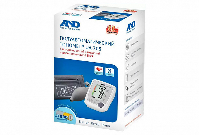 Полуавтоматический тонометр AND UA-705 — это точный и надежный прибор для измерения артериального давления и частоты пульса на плече. Он сочетает в себе удобство автоматического анализа данных с экономичным ручным нагнетанием воздуха с помощью груши. Это позволяет снизить стоимость прибора и обеспечивает долгий срок службы. Оснащен встроенным стетоскопом в манжете, что исключает необходимость в отдельном фонендоскопе. Крупный, хорошо читаемый дисплей отображает результаты измерения, а также индикатор повышенного давления и аритмии. Функция интеллектуального сброса давления Smart Release обеспечивает комфортное измерение. Подходит для индивидуального или семейного использования.