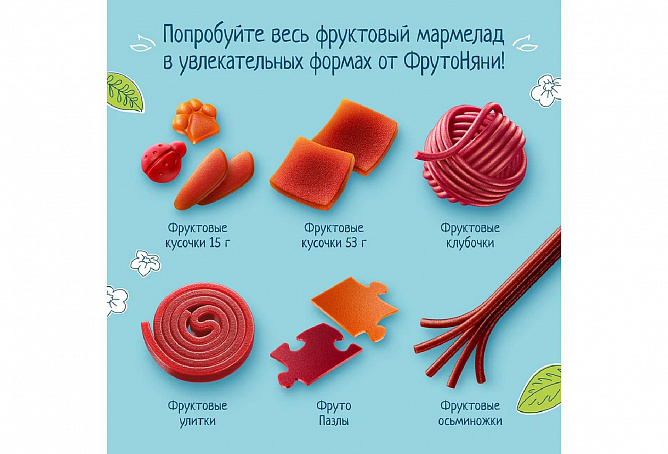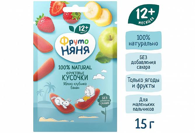 Фруктовые кусочки «ФрутоНяня» — это вкусное и полезное лакомство для детей от 1 года. Оно приготовлено только из натуральных фруктов и ягод без добавления сахара. С фруктовыми кусочками «ФрутоНяня» можно баловать малыша без лишних забот.