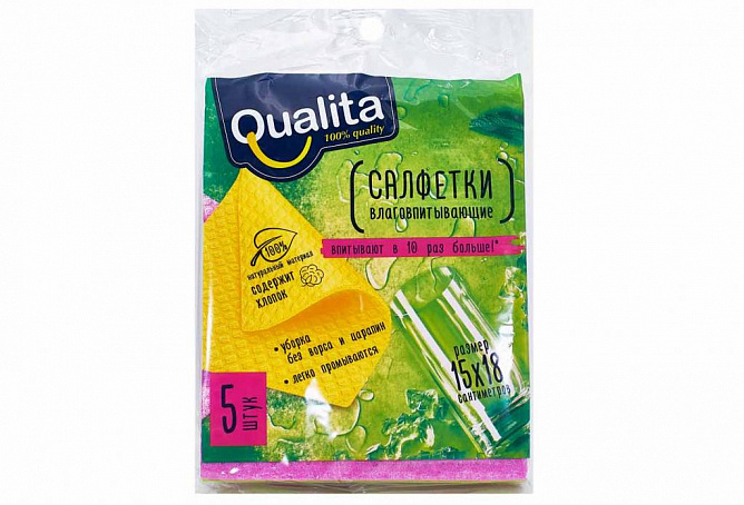 Комплект включает 5 салфеток, каждая из которых имеет оптимальный размер для удобного использования. Салфетки можно легко отжать и они быстро высыхают, что упрощает их дальнейшее использование. Благодаря компактным размерам и удобной упаковке, салфетки QUALITA можно всегда держать под рукой на кухне, в ванной или в автомобиле.