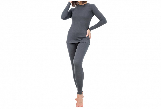 Женский термокомплект выполнен из плотной хлопковой ткани рибана темно-серого цвета. В наборе однотонные легинсы и удлиненный лонгслив. Натуральный хлопок приятен к телу, позволяет коже дышать и хорошо отводит влагу. Важная функция хлопка – утепление, за эластичность и прочность отвечает небольшое количество лайкры в составе трикотажной ткани. Все внутренние швы гладкие и аккуратные, они незаметны и не доставляют дискомфорт. Прилегающий крой не стесняет движения. Манжеты на рукавах и штанинах надежно удерживают тепло. Демисезонное термобелье для женщин предназначено для средней и низкой активности в прохладную погоду. Хлопковое термо белье женское отлично подойдет для прогулок поздней осенью, ранней весной или зимой, для турпоходов, бега, занятий спортом или йогой, а также в качестве домашнего костюма. Для того, чтобы спортивное нательное белье из трикотажа долго сохраняло свои первоначальные свойства, необходимо придерживаться рекомендаций по уходу: бережная машинная или ручная стирка при температуре не более 30° С, низкие обороты при сушке. Широкий размерный ряд, есть большие размеры зимнего комплекта термобелья для женщин.