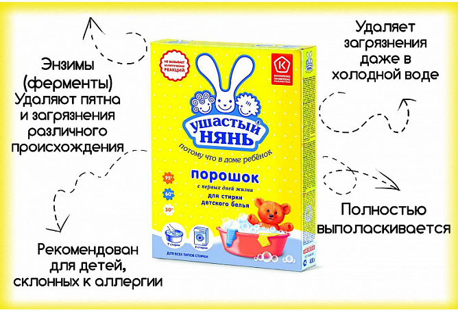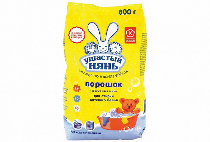 Благодаря этим особенностям стиральный порошок «Ушастый нянь» может быть рекомендован даже для детей, склонных к аллергии, что подтверждают специалисты ФБУН «Северо-Западный научный центр гигиены и общественного здоровья» (г. Санкт-Петербург). Стиральный порошок «Ушастый нянь» получил знак "Роскачества" в 2019 году как товар повышенного качества.