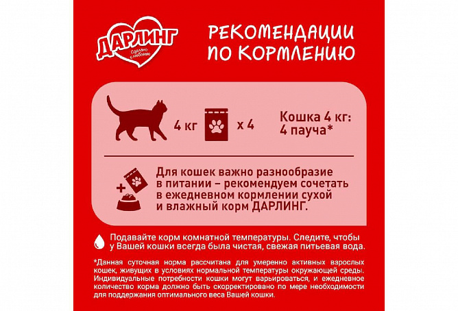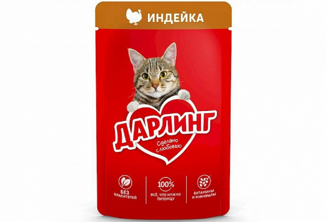 Без красителей и без добавления искусственных ароматизаторов и консервантов. Для кошек важно разнообразие в питании – рекомендуем сочетать в ежедневном кормлении сухой и влажный корм ДАРЛИНГ.