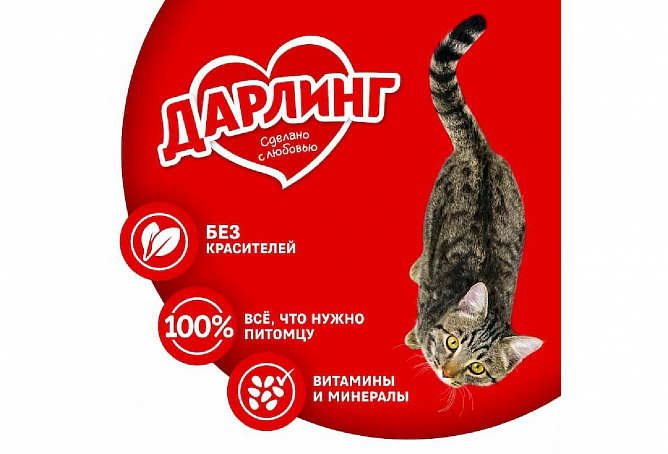 Корм ДАРЛИНГ для кошек – это сбалансированное питание, в котором содержится на 100% всё, что нужно кошке каждый день. Он сделан с любовью из качественных ингредиентов, а также содержит витамины и минералы, необходимые Вашей кошке, чтобы быть здоровой, активной и дарить радость Вашей семье.