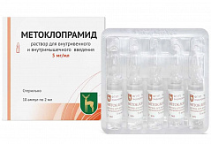 Метоклопрамид 5 мг/мл (10мг/2мл) раствор в/в, внутримышечного 2мл ампулы N10