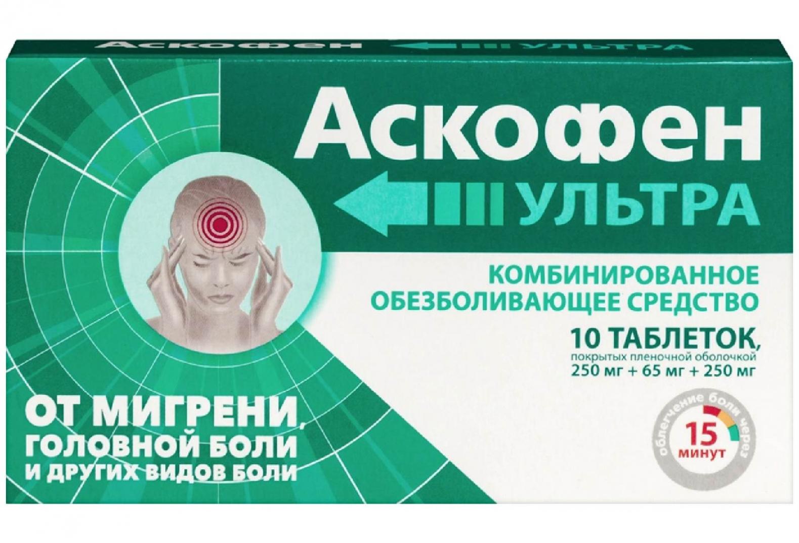 Аскофен® Ультра — новый анальгетик с доказанным международными исследованиями действием комбинации против мигрени, головной боли и других видов боли. С заботой о Вас в борьбе с болью. Доказанное многочисленными масштабными исследованиями действие комбинации «парацетамол 250 мг + ацетилсалициловая кислота 250 мг + кофеин 65 мг» против головной боли и мигрени — более 30 лет исследований. Преимущества препарата Аскофен® Ультра Подходит в качестве комбинированной терапии при тяжелых приступах мигрени Подходит для начальной стадии терапии мигрени Имеет преимущество перед ибупрофеном в купировании болевого синдрома согласно исследованиям Способствует началу развития облегчения головной и других видов боли уже через 15 минут при приеме 2 таблеток. Преимущества формы выпуска Таблетки в пленочной оболочке удобнее проглатывать, обеспечивается лучшая стабильность действующих веществ. Используемые источники предоставленной информации: -Goldstein J, Hagen M2, Gold M. Results of a multicenter, double-blind, randomized, parallel-group, placebo-controlled, single-dose study comparing the fixed combination of acetaminophen, acetylsalicylic acid, and caffeine with ibuprofen for acute treatment of patients with severe migraine (Результаты многоцентрового, двойного слепого, рандомизированного, параллельного группового, плацебо-контролируемого, однократного исследования по сравнению фиксированной комбинации парацетамола, ацетилсалициловой кислоты и кофеина с ибупрофеном для лечения острых тяжелых приступов мигрени). Cephalalgia. 2014 Nov;34(13):1070-8. [PubMed]; -American Headache Society (Американское сообщество по лечению головной боли) The American Headache Society Position Statement On Integrating New Migraine Treatments Into Clinical Practice (Заявление о позиции Американского сообщества по лечению головной боли в отношении внедрения нового лечения мигрени в клиническую практику) // Headache: The Journal of Head and Face Pain. 2018. № 1 (59). C. head.13456; -Goldstein J, Hagen M2, Gold M. Results of a multicenter, double-blind, randomized, parallel-group, placebo-controlled, single-dose study comparing the fixed combination of acetaminophen, acetylsalicylic acid, and caffeine with ibuprofen for acute treatment of patients with severe migraine (Результаты многоцентрового, двойного слепого, рандомизированного, параллельного группового, плацебо-контролируемого, однократного исследования по сравнению фиксированной комбинации парацетамола, ацетилсалициловой кислоты и кофеина с ибупрофеном для лечения острых тяжелых приступов мигрени). Cephalalgia. 2014 Nov;34 (13):1070-8; -инструкция по медицинскому применению