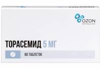 Активное вещество: 1 таблетка содержит: торасемид 5,00 мг Вспомогательные вещества: Лактозы моногидрат 58,44 мг, крахмал кукурузный 14,56 мг, карбоксиметилкрахмал натрия 0,80 мг, кремния диоксид коллоидный безводный 0,60 мг, магния стеарат 0,60 мг..