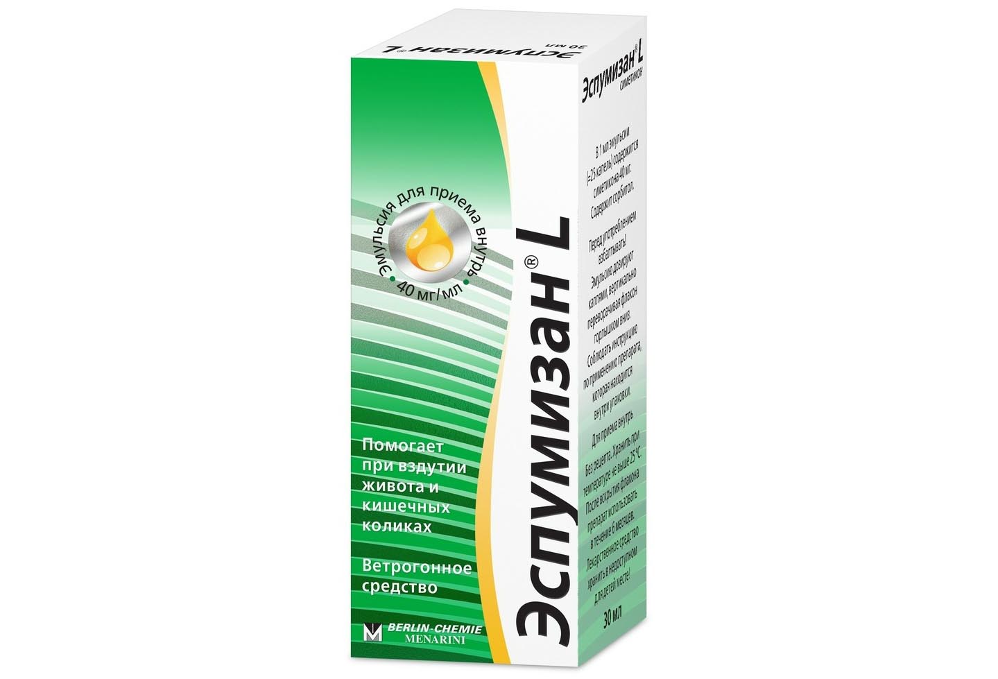 Фармакологическая группа: Ветрогонное средство Код АТХ A03AX13 Фармакодинамика: Эспумизан - препарат, уменьшающий количество газов в кишечнике. Действующее вещество - симетикон обладает поверхностной активностью свойствами и способностью снижать поверхностное натяжение на границе сред жидкость/газ. При этом происходит слияние пузырьков газа и разрушение пены, вследствие чего высвободившийся газ получает возможность всасываться и выводиться естественным путем под воздействием перистальтики кишечника. Применение препарата Эспумизан для подготовки к проведению диагностических исследований предупреждает возникновение дефектов изображения, вызываемых пузырьками газа.