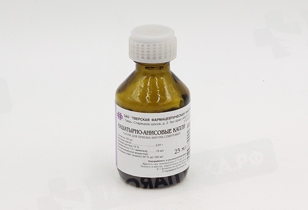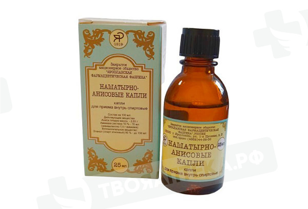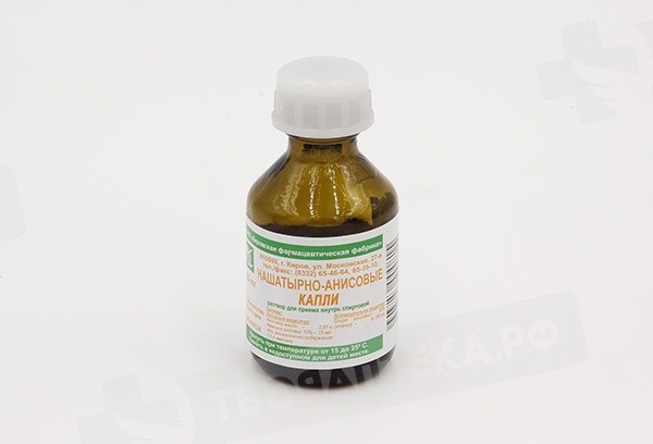 Активное вещество: 100 мл капель содержит: анисовое масло – 2,81 г, аммиака раствор 10 % [эквивалентно 1,5 г аммиака] – 15 мл Вспомогательные вещества: Этиловый спирт (этанол) 90 % до 100 мл