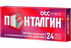 Обойдемся без боли! Пенталгин® — запатентованный обезболивающий пятикомпонентный препарат, обладающий выраженным анальгетическим действием, избавляющий от спазма и снимающий воспаление. Усиливает обезболивающий эффект за счет комбинации действующих компонентов; Одновременно воздействует на различные этапы формирования болевого синдрома; Сниженные дозы основных обезболивающих компонентов по сравнению с монопрепаратами; Обладает комплексным действием: это одновременно обезболивающее, противовоспалительное, спазмолитическое и жаропонижающее; Купирует боль различного генеза; Таблетки в пленочной оболочке удобнее проглатывать, обеспечивается лучшая стабильность действующих веществ. Таблетки, покрытые пленочной оболочкой от светло-зеленого до зеленого цвета, двояковыпуклые в форме капсулы со скошенными краями, с риской на одной стороне и тиснением PENTALGIN на другой. На поперечном разрезе ядро светло-зеленого цвета с белыми вкраплениями
