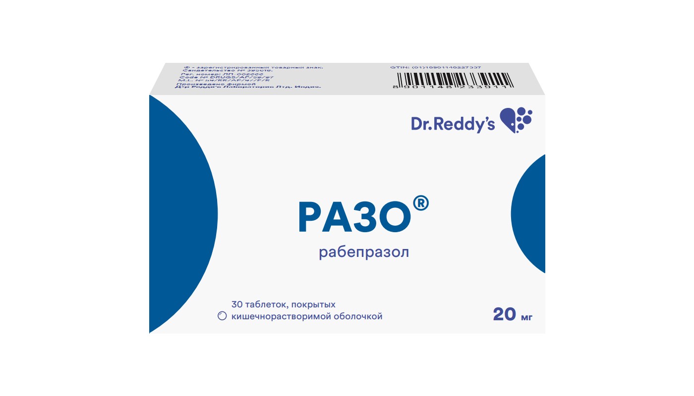 Таблетки Разо® принимают внутрь целиком, не разжевывая и не измельчая. Установлено, что ни время суток, ни прием пищи не влияют на активность рабепразола. При язвенной болезни желудка в стадии обострения и язве анастомоза рекомендуется принимать внутрь по 20 мг один раз в день. Обычно излечение наступает после 6 недель терапии, однако в некоторых случаях длительность лечения может быть увеличена. При язвенной болезни двенадцатиперстной кишки в стадии обострения рекомендуется принимать внутрь по 20 мг один раз в день. Длительность лечения составляет от 2 до 4 недель. В случае необходимости длительность лечения может быть увеличена еще на 4 недели. При лечении эрозивной и язвенной гастроэзофагеальной рефлюксной болезни или рефлюкс-эзофагита рекомендуется принимать внутрь по 20 мг один раз в день. Длительность лечения составляет от 4 до 8 недель. В случае необходимости длительность лечения может быть увеличена еще на 8 недель. При поддерживающей терапии гастроэзофагеальной рефлюксной болезни рекомендуется принимать внутрь по 20 мг один раз в день. Длительность лечения зависит от состояния пациента. При неэрозивной гастроэзофагеальной рефлюксной болезни рекомендуется принимать внутрь по 20 мг один раз в день. Если после четырех недель лечения симптомы не исчезают, следует провести дополнительное обследование пациента. После купирования симптомов для предупреждения их последующего возникновения следует принимать препарат внутрь один раз в день по требованию. Для лечения синдрома Золлингера-Эллисона и других состояний, характеризующихся патологической гиперсекрецией, дозу подбирают индивидуально. Начальная доза – 60 мг в день, затем дозу повышают и назначают препарат в дозе до 100 мг в день при однократном приеме или по 60 мг два раза в день. Для некоторых пациентов дробное дозирование препарата является предпочтительным. Лечение должно продолжаться по мере клинической необходимости. У некоторых пациентов с синдромом Золлингера-Эллисона длительность лечения рабепразолом может составлять до одного года. Для эрадикации Helicobacter pylori рекомендуется принимать внутрь по 20 мг два раза в день по определенной схеме с соответствующей комбинацией антибиотиков. Длительность лечения составляет 7 дней. Пациенты с почечной и печеночной недостаточностью. Коррекция дозы пациентам с почечной недостаточностью не требуется. У пациентов с легкой и умеренной степенью печеночной недостаточности концентрация рабепразола в крови обычно выше, чем у здоровых пациентов. При назначении препарата Разо® пациентам с тяжелой степенью печеночной недостаточности следует соблюдать осторожность. Пожилые пациенты. Коррекция дозы не требуется. Дети. Безопасность и эффективность применения рабепразола у детей в возрасте 12 лет и старше установлена для краткосрочного (до 8 недель) лечения ГЭРБ. Рекомендуемая доза для детей в возрасте 12 лет и старше составляет 20 мг 1 раз в день продолжительностью до 8 недель. Безопасность и эффективность рабепразола у пациентов детского возраста для применения по другим показаниям не установлена.