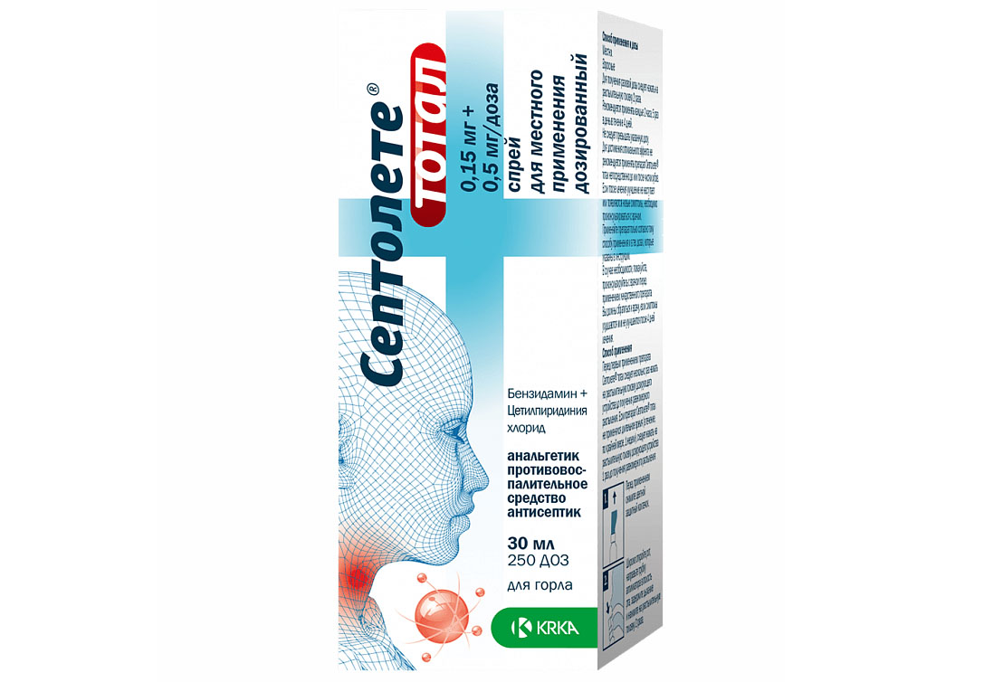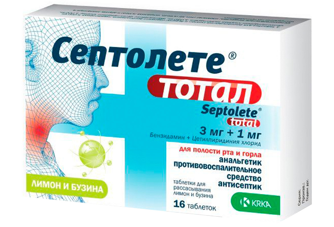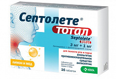 Тройное действие быстро настроит твое горло на нормальный лад! Септолете Тотал за счет уникального сочетания двух активных ингредиентов предлагает тройное действие для того, чтобы настроить Ваше горло на нормальный лад: быстро облегчает боль, уменьшает воспаление, устраняет причины инфекции (вирусы, бактерии, грибки. Круглые таблетки со скошенными краями с шероховатой поверхностью от светло-голубого до голубого цвета. Допускается белый налет, неравномерность окрашивания, наличие пузырьков воздуха в карамельной массе и незначительная неровность краев.