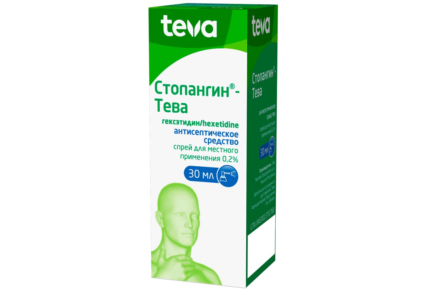 Фармакологическая группа: Антисептическое средство Код АТХ R02AA20 Фармакодинамика: Cтопангин®-Тева - антисептическое средство. Противомикробное действие препарата связано с подавлением окислительных реакций метаболизма бактерий (антагонист тиамина). Препарат обладает широким спектром антибактериального и противогрибкового действия, в частности в отношении грамположительных и грамотрицательных бактерий и грибов рода Candida. Развитие устойчивости не наблюдалось.