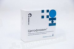 Фармакологическая группа: Метаболическое средство. Фармакодинамика: Фармакологические эффекты обусловлены комплексным воздействием входящих в состав препарата ЦИТОФЛАВИН компонентов. Янтарная кислота (ЯК) - эндогенный внутриклеточный метаболит цикла Кребса, выполняющий в клетках организма универсальную энергосинтезирующую функцию. При участии кофермента флавинадениндинуклеотида (ФАД) янтарная кислота митохондриальным ферментом сукцинатдегидрогеназой быстро трансформируется в фумаровую кислоту и далее в другие метаболиты цикла трикарбоновых кислот. Стимулирует аэробный гликолиз и синтез АТФ в клетках. Конечным продуктом метаболизма янтарной кислоты в цикле Кребса является двуокись углерода и вода. Янтарная кислота улучшает тканевое дыхание за счёт активации транспорта электронов в митохондриях. Рибофлавин (витамин В2) является флавиновым коферментом (ФАД), активирующим сукцинадегидрогеназу и другие окислительно-восстановительные реакции цикла Кребса. Никотинамид (витамин РР), амид никотиновой кислоты. Никотинамид в клетках, путем каскада биохимических реакций, трансформируется в форму никотинамидадениннуклеотида (НАД) и его фосфата (НАДФ), активируя никотинамид-зависимые ферменты цикла Кребса, необходимых для клеточного дыхания и стимуляции синтеза АТФ. Инозин является производным пурина, предшественником АТФ. Обладает способностью активировать ряд ферментов цикла Кребса, стимулируя синтез ключевых ферментов-нуклеотидов: флавинадениндинуклеотида (ФАД) и никотинамидадениндинуклеотида (НАД). Таким образом, все компоненты Цитофлавина являются естественными метаболитами организма и стимулируют тканевое дыхание. Метаболическая энергокоррекция, антигипоксическая и антиоксидантная активность препарата, определяющие фармакологические свойства и лечебную эффективность составляющих, обусловлена взаимодополняющим действием янтарной кислоты, инозина, никотинамида и рибофлавина.