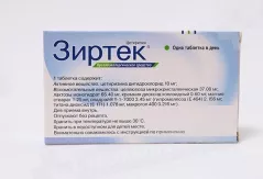 Фармакологическая группа: Противоаллергическое средство - Н1-гистаминовых рецепторов блокатор Код АТХ R06AE07 Фармакодинамика: Механизм действия Цетиризин - активное вещество препарата Зиртек® - является метаболитом гидроксизина, обладает антигистаминным эффектом с противоаллергическим действием. Цетиризин относится к группе конкурентных антагонистов гистамина и блокирует H1-гистаминовые рецепторы с небольшим воздействием на другие рецепторы и практически не оказывает антихолинергического и антисеротонинового действия. Цетиризин оказывает влияние на гистаминзависимую стадию аллергических реакций немедленного действия, а также уменьшает миграцию эозинофилов и ограничивает высвобождение медиаторов при аллергических реакциях замедленного типа. Практически не проходит через гематоэнцефалический барьер и, следовательно, почти не способен достичь центральных рецепторов Н1. В исследованиях влияния гистамина на кожу действие цетиризина в дозе 10 мг начиналось через 1 час, достигало максимума со 2-го по 12-ый час и все еще наблюдалось на статистически значимых уровнях через 24 часа. В дополнении к антигистаминному эффекту цетиризин также обладает противовоспалительным эффектом и тем самым оказывает влияние на позднюю фазу аллергической реакции: - При дозе 10 мг один или два раза в день, ингибирует позднюю фазу агрегации эозинофилов в коже; - При дозе 30 мг в день, ингибирует выведение эозинофилов в бронхиальную альвеолярную жидкость после вызванного аллергеном бронхиального сужения; - Ингибирует вызванную калликреином позднюю воспалительную реакцию; - Подавляет экспрессию маркеров воспаления, таких как ICAM-1 или VCAM-1; - Ингибирует действие гистаминолибераторов, таких как PAF или субстанция Р.