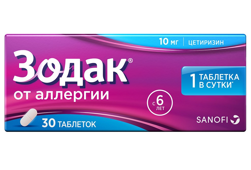 Фармакологическая группа: Противоаллергическое средство – H1-гистаминовых рецепторов блокатор Код АТХ R06AE07 Фармакодинамика: Цетиризин - активное вещество препарата Зодак® - является метаболитом гидроксизина, относится к группе конкурентных антагонистов гистамина и блокирует Н1-гистаминовые рецепторы. В дополнение к антигистаминному эффекту цетиризин предупреждает развитие и облегчает течение аллергических реакций: в дозе 10 мг один или два раза в день ингибирует позднюю фазу агрегации эозинофилов в коже и конъюнктиве пациентов, имеющих аллергические реакции. Клиническая эффективность и безопасность: Исследования на здоровых добровольцах показали, что цетиризин в дозах 5 или 10 мг значительно ингибирует реакцию в виде сыпи и покраснения на введение в кожу гистамина в высокой концентрации, однако корреляция с эффективностью не установлена. В 6-недельном плацебо-контролируемом исследовании с участием 186 пациентов с аллергическим ринитом и сопутствующей бронхиальной астмой легкого и среднетяжелого течения, показано, что прием цетиризина в дозе 10 мг один раз в сутки уменьшает симптомы ринита и не влияет на функцию легких. Результаты данного исследования подтверждают безопасность применения цетиризина у пациентов, страдающих аллергией и бронхиальной астмой легкого и среднетяжелого течения. В плацебо-контролируемом исследовании показано, что прием цетиризина в дозе 60 мг в сутки в течение 7 дней не вызывал клинически значимого удлинения интервала QT. Прием цетиризина в рекомендуемой дозе показал улучшение качества жизни пациентов с круглогодичным и сезонным аллергическими ринитами. В клинических исследованиях показано, что цетиризин начинает действовать через 20 минут после приема, его эффект сохраняется до 24 часов. Дети: В 35-дневном исследовании с участием пациентов в возрасте 5-12 лет не выявлено признаков невосприимчивости к антигистаминному эффекту цетиризина. Нормальная реакция кожи на гистамин восстанавливалась в течение трех дней после отмены препарата при его неоднократном применении.